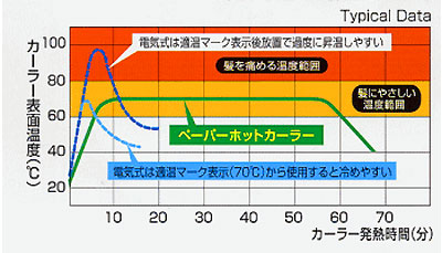●発熱体をカーラーに入れるだけ。適温(60〜80℃)を約50分間持続し、その間、スチームが髪にうるおいを与えます。