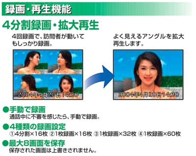 ●4画面分割の撮影・録画が可能。見たい画像の拡大もできます。 ●暗い時でもカラーで撮影する白色LEDランプの照明を内蔵。 ●呼出ボタンを押した後、室内の家族に直接呼びかけることができるファミリーコール機能。 ●通話ボタンを一度押すだけで訪問者とハンズフリーで会話ができます。
