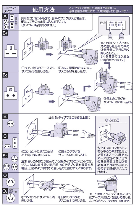 ●世界中のほとんどのコンセントがこれひとつでOKです。 ●7タイプのプラグがひとつのボディに。 ●最近中国で増えている新タイプ(Ocタイプ)に対応しています。 ※このプラグでは電圧の変換はできません。 ※このプラグは海外専用です。日本では使えません。